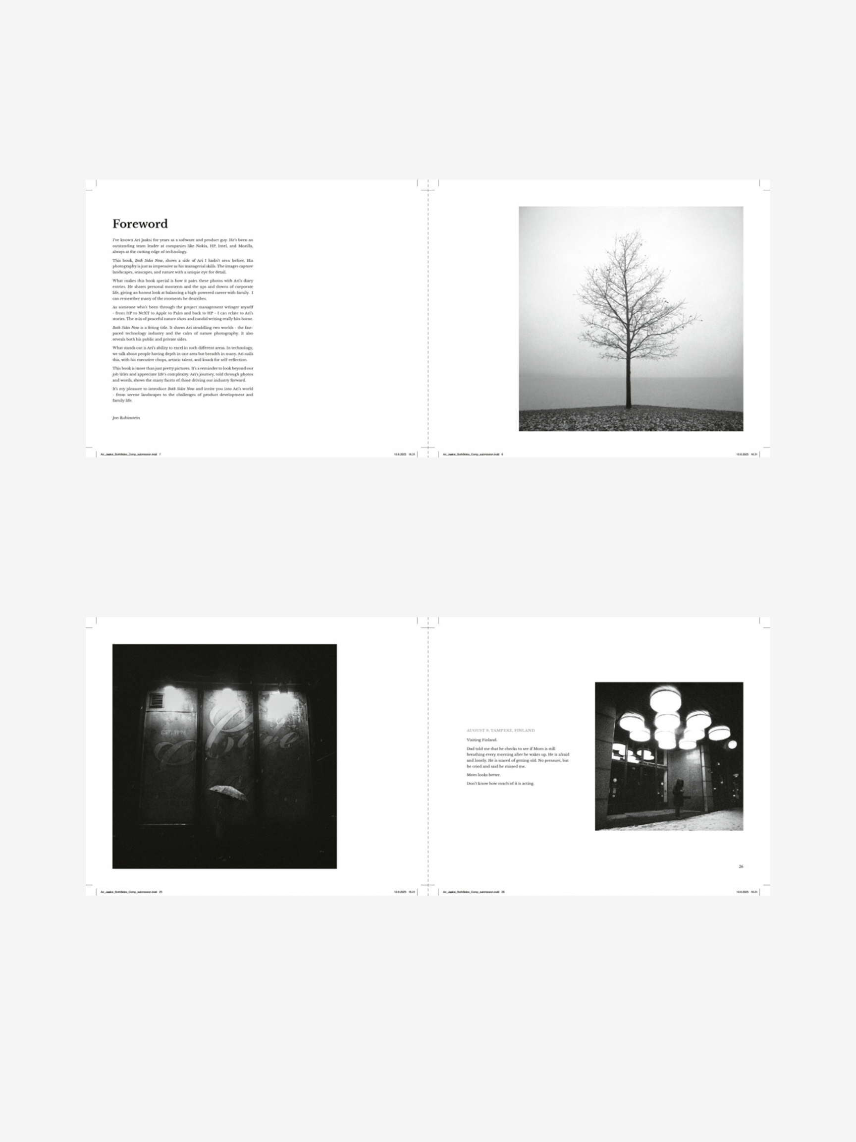 Adding perspective is a foreword byย Jon RubinsteinโSilicon Valley icon, longtime product leader, and Steve Jobsโ right hand in building Appleโs most influential devices. Rubinstein, who worked alongside Jaaksi in the technology trenches, recalls Ari as a brilliant team leader at the cutting edge of innovation. In his words, this book reveals a side of Jaaksi few have seen: an artist with as much command behind the lens as in the boardroom.